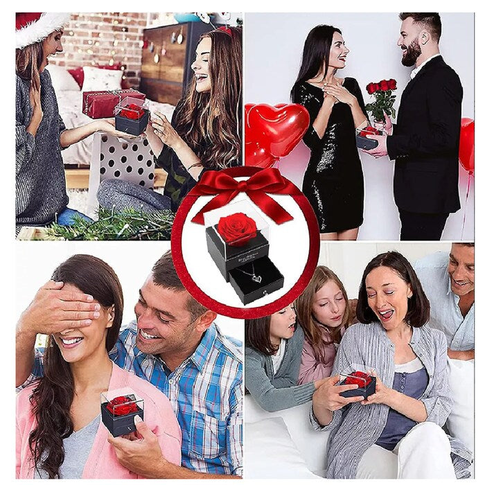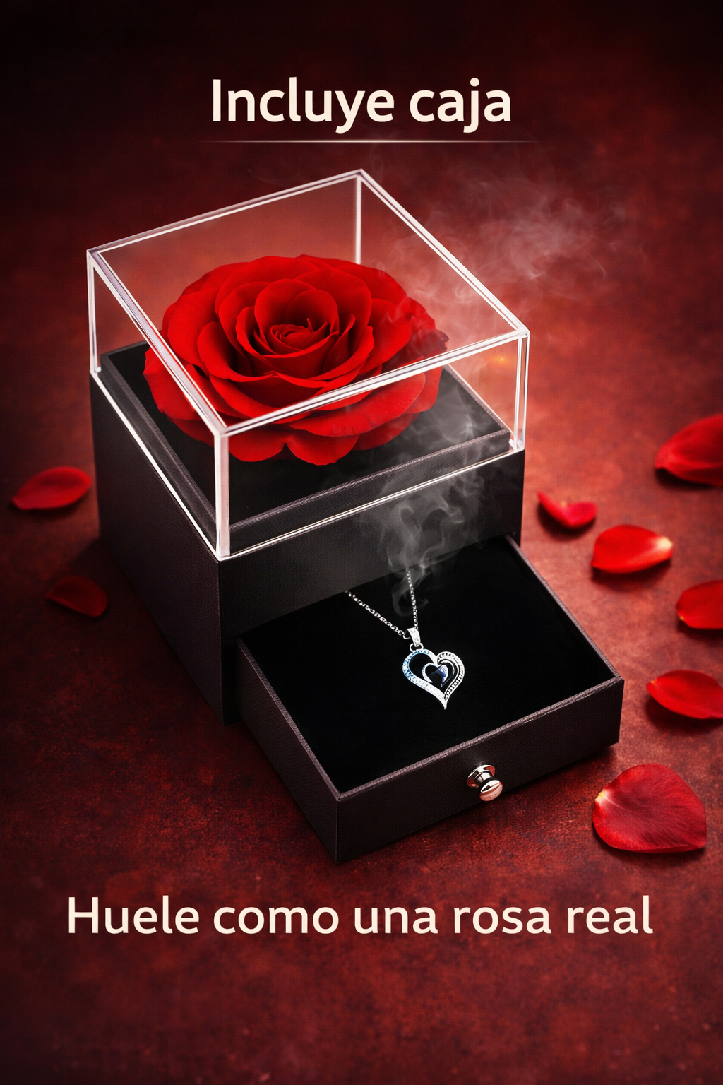 Este set de lujo incluye una rosa que mantiene, color y aroma auténtico por años, presentada en un elegante estuche con un cajón secreto.